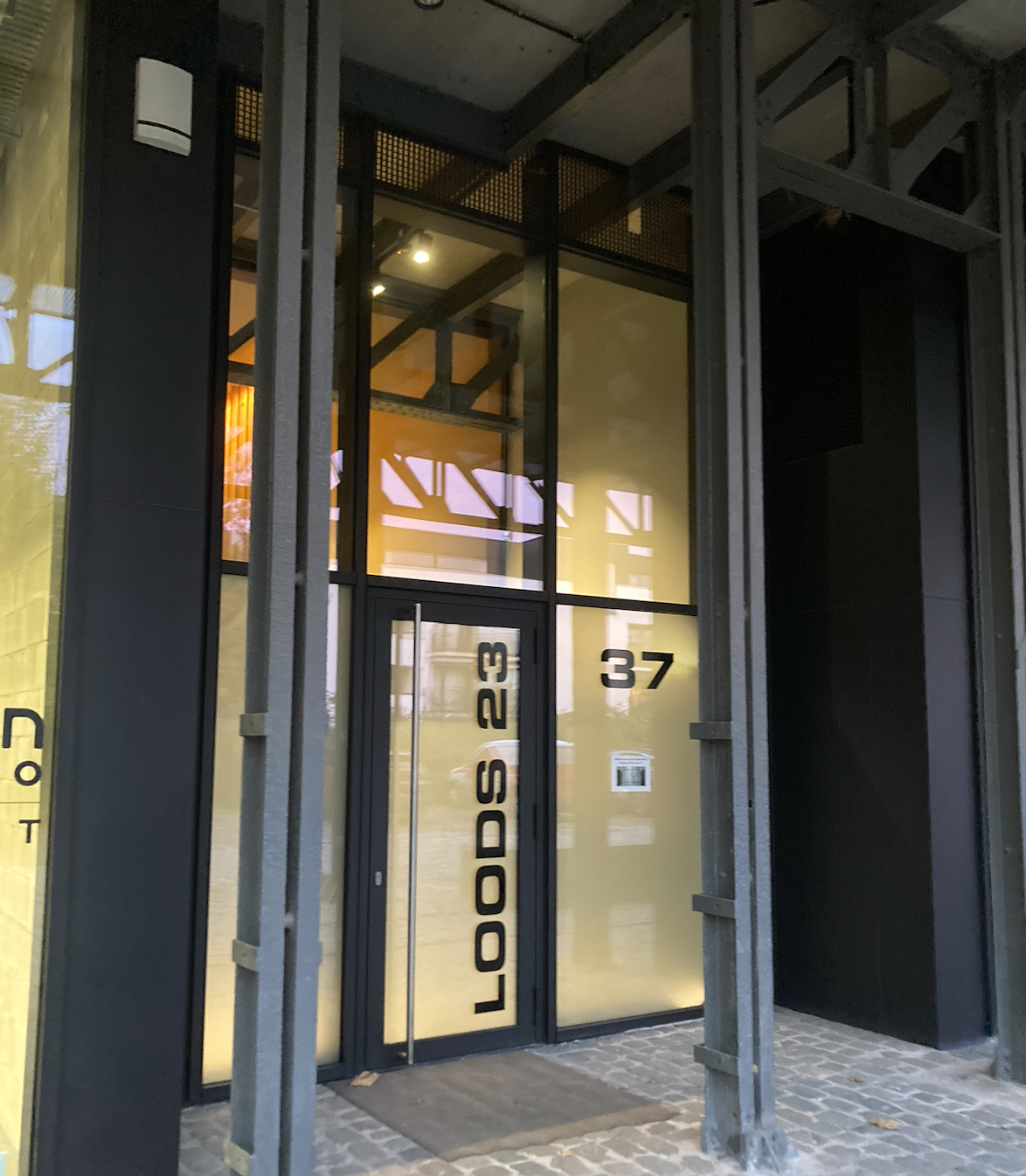 Je ziet een gerestaureerde loods aan de rechterkant – dat is het gebouw waarin de praktijk zich bevindt. De ingang is in het midden van het gebouw, en de straatnummer '37' en de naam van het gebouw 'Loods 23' staan in grote letters op de deur.